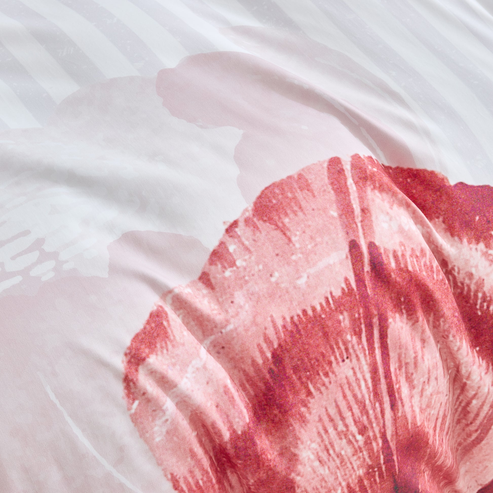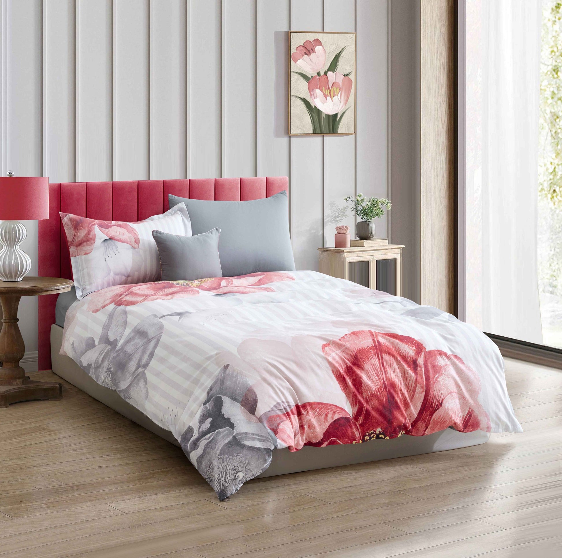 A large-scale magnolia floral design in soft pink and grey on a calming white satin striped base brings this signature Fine Weaves design together. The silver grey reverse is silky smooth in 100% cotton sateen. To tie the look together the set includes free throw pillow covers.